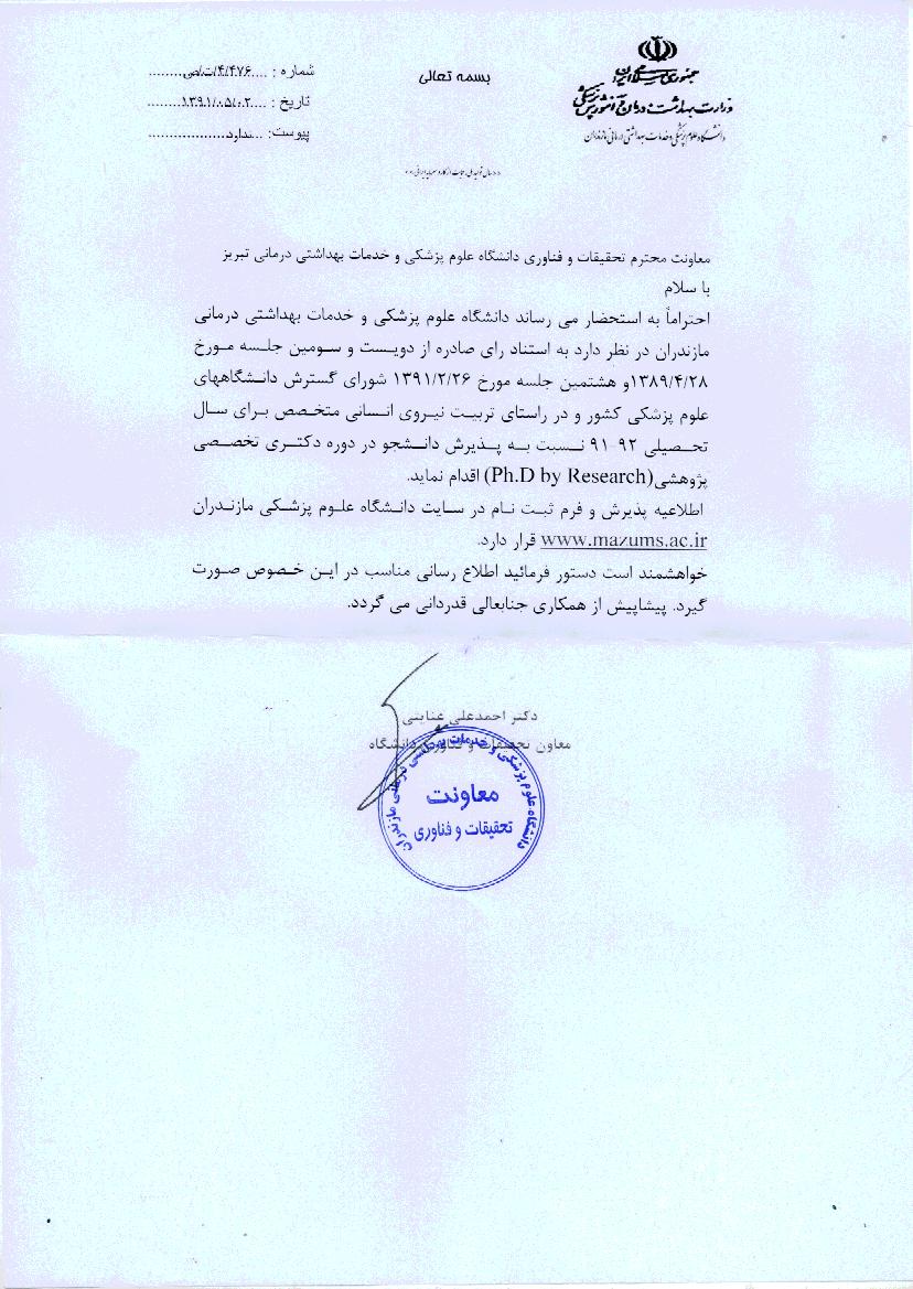 پذیرش دانشجو در دوره دكتري تخصصي پژوهشي دانشگاه علوم پزشكي مازندران