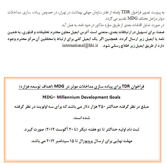 تاریخ انتشار : چهارشنبه ۱۹ مهر ۱۳۹۱ تعداد بازدید کنندگان خبر : 985 زمان مطالعه : 0 دقیقه فراخوان TDR براي پياده سازي MDG ... کد خبر : 32106 کپی ارسال نظر ثبت