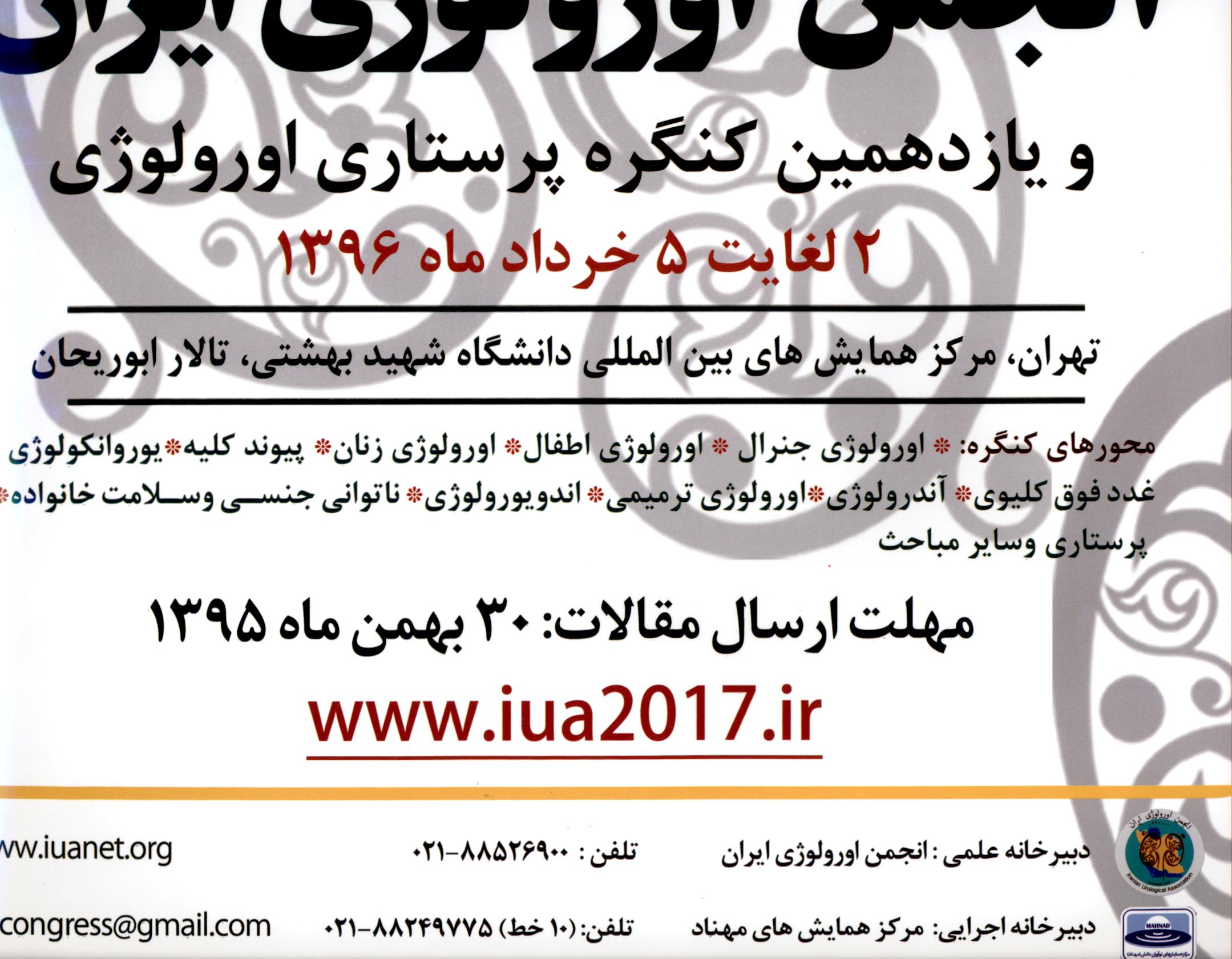 <<بیستمین کنگره انجمن اورولوژی ایران>> و <<یازدهمین کنگره پرستاری اورولوژی>> توسط انجمن اورولوژی ایران با همکاری دانشگاه علوم پزشکی کشور از تاریخ 2 لغایت 5 خرداد 1396 در تهران،مرکز همایش های بین المللی دانشگاه شهید بهشتی برگزار خواهد شد.