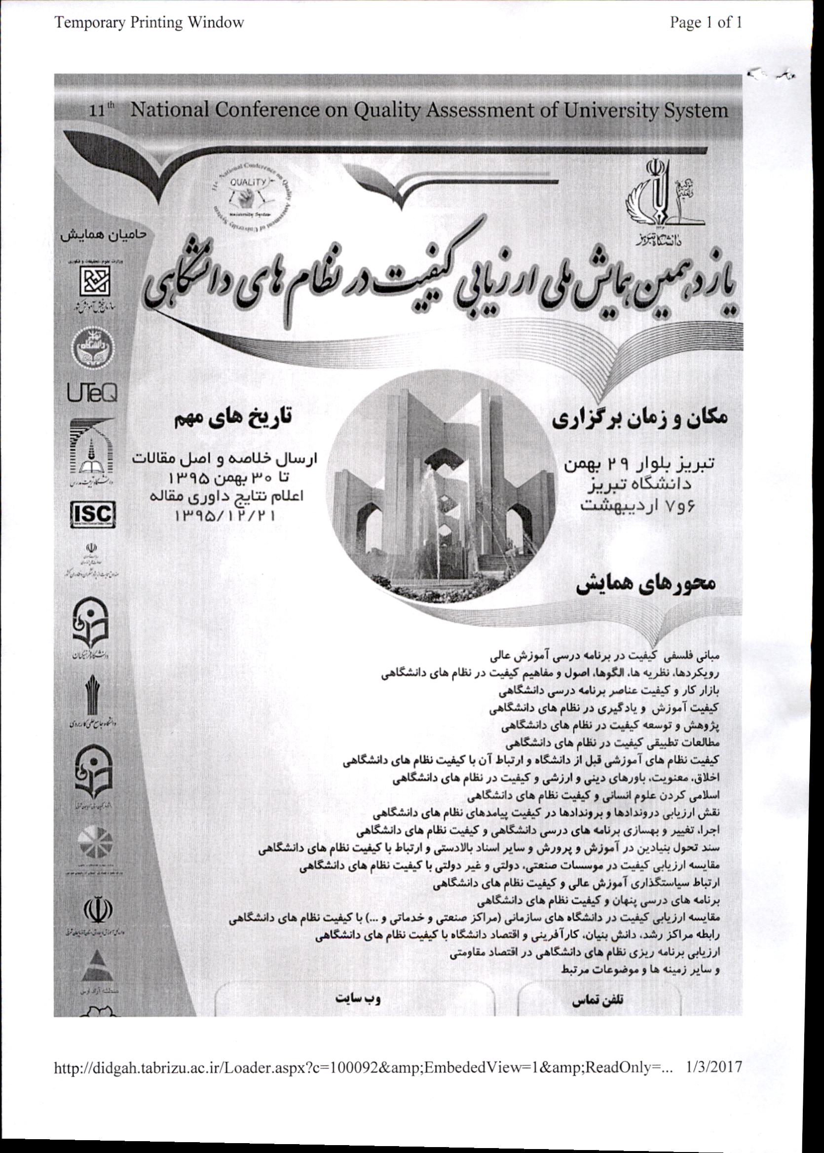 یازدهمین همایش ارزیابی کیفیت در نظامهای دانشگاهی در مورخه 6 و7 اردیبهشت ماه 96 به میزبانی دانشگاه تبریز برگزار خواهد شد..