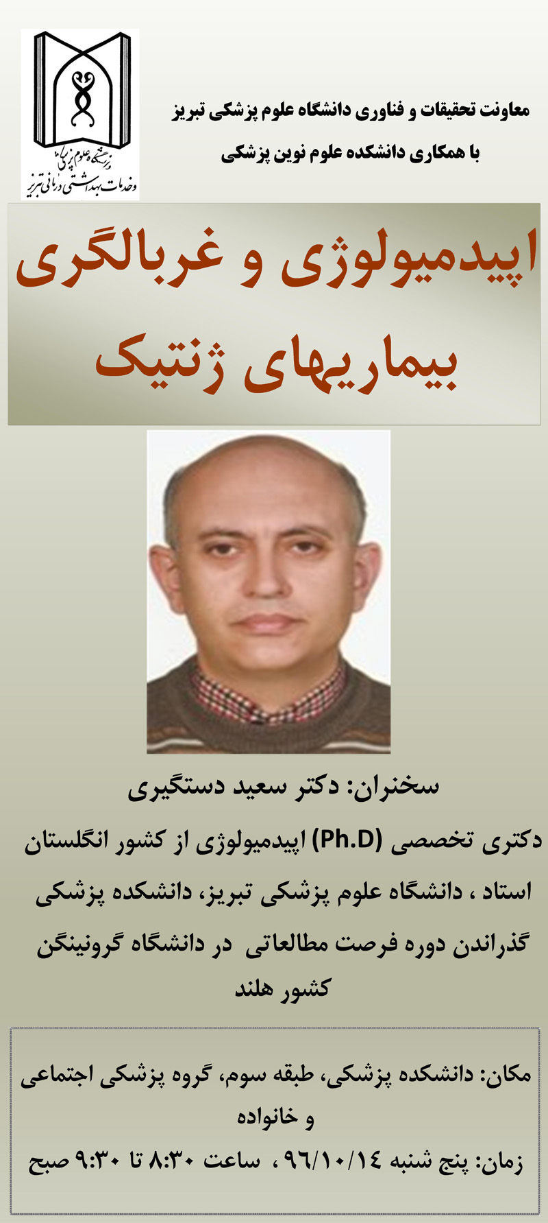 سخنرانی آقای دکتر سعید دستگیری عضو محترم هیات علمی دانشکده پزشکی که روز پنج شنبه مورخ 14/10/96 در دانشکده پزشکی، طبقه سوم، گروه پزشکی اجتماعی و خانواده برگزار می شود.