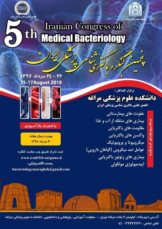 پنجمینن کنگره باکتری شناسی ایران در تاریخ 24 تا 26 مرداد ماه در دانشکده علوم پزشکی مراغه با همکاری انجمن باکتری شناسی ایران برگزار خواهد شد.