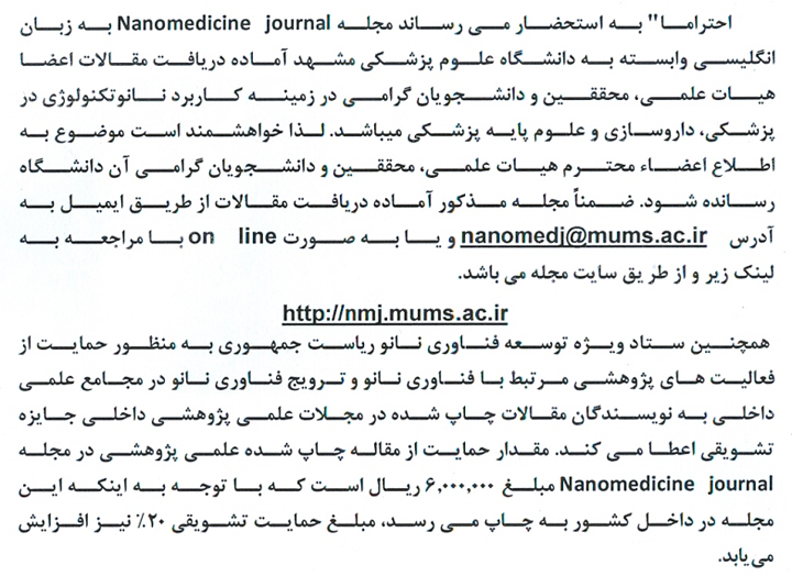 اطلاعيه مجله nanomedicineدانشگاه مشهد ... کد خبر : 32168 کپی کلمات کلیدی : دانشگاه علوم پزشکی تبریز اطلاعيه مجله nanomedicineدانشگاه مشهد
