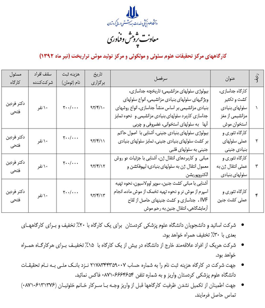 كارگاهاي مركز تحقيقات علوم سلولي و مولكولي و مركز توليد موش تراريخت- دانشگاه علوم پزشكي كردستان
