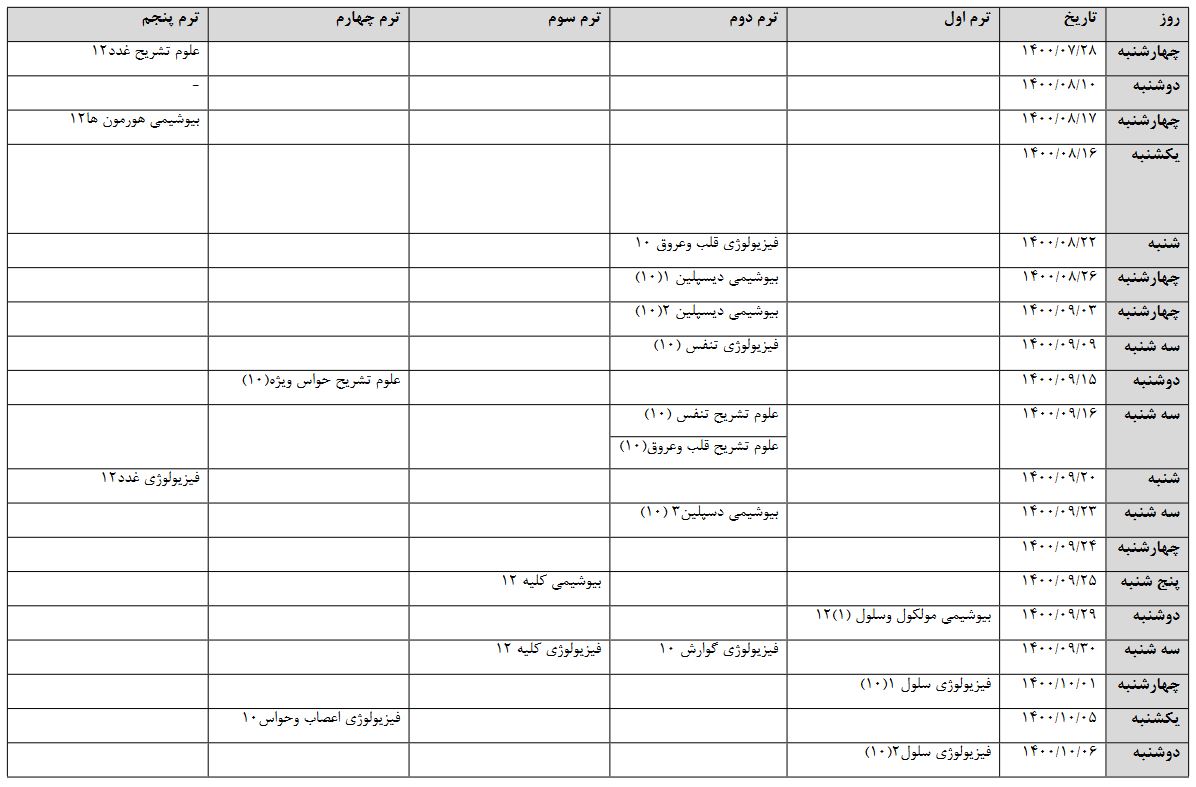 برنامه زمانبندی آزمونهای پایان ترم مقطع علوم پایه در نیمسال اول 1401-1400