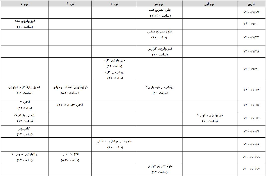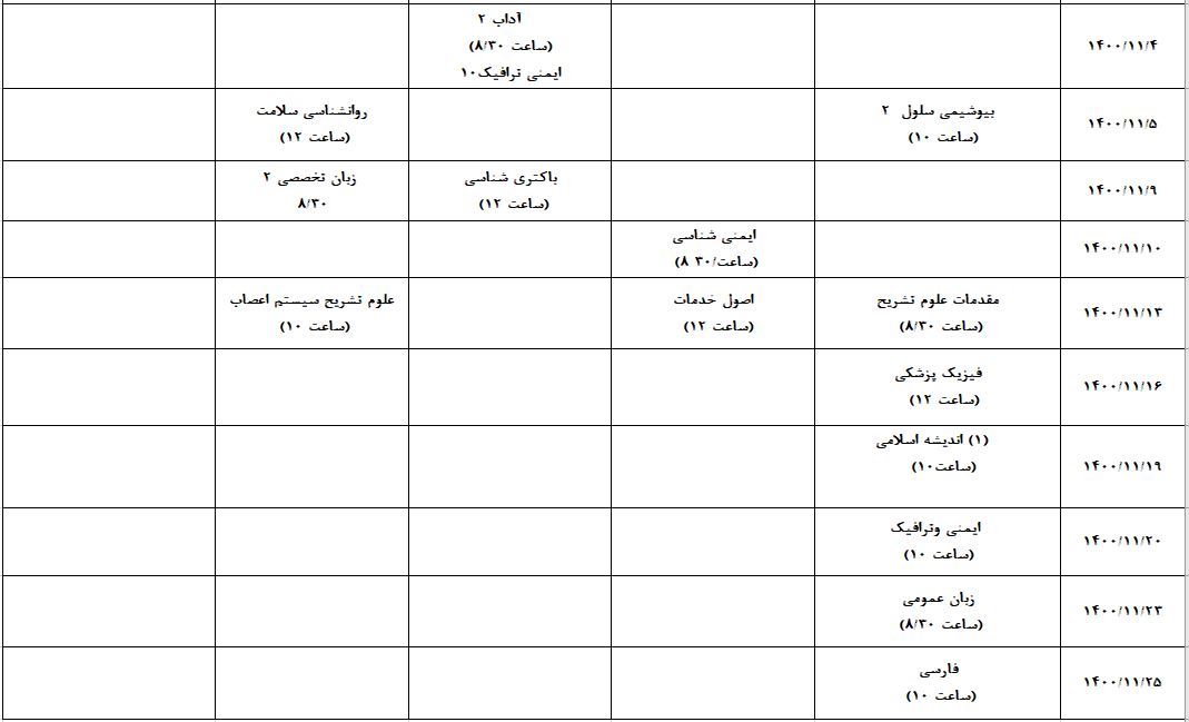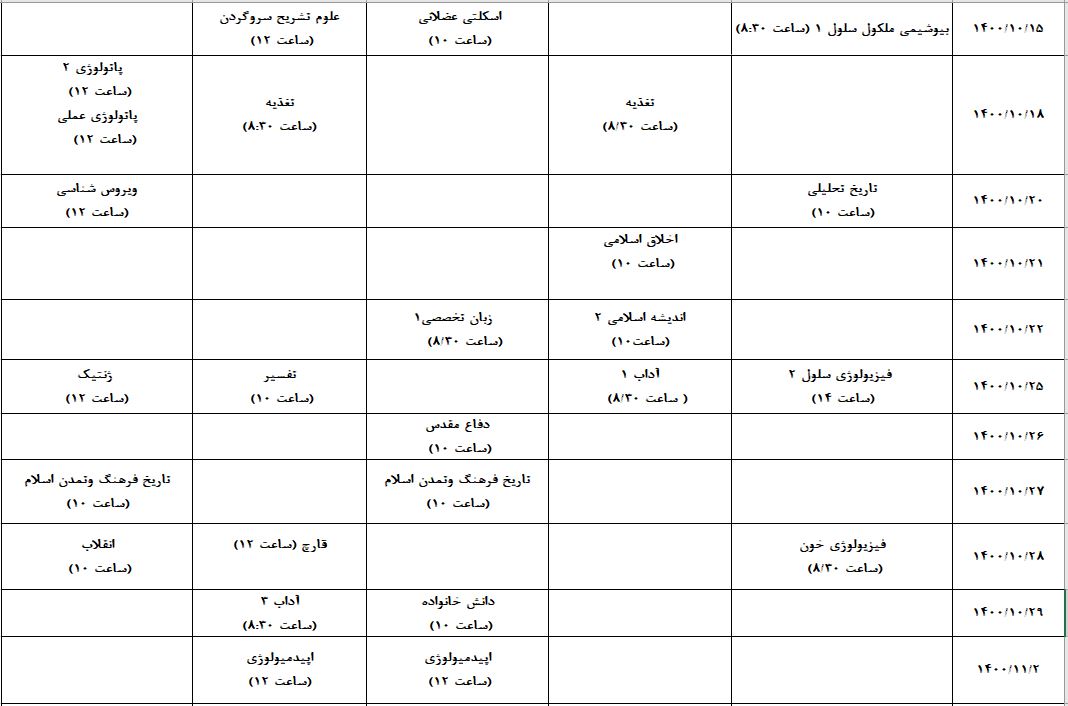 برنامه نهایی زمانبندی آزمونهای پایان ترم مقطع علوم پایه در نیمسال اول 1401-1400
