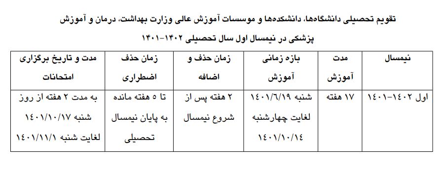 تقویم تحصیلی دانشگاه ها، دانشکده ها و مؤسسات آموزش عالی وزارت بهداشت، درمان و آموزش پزشکی در نیمسال اول سالتحصیلی 1402-1401