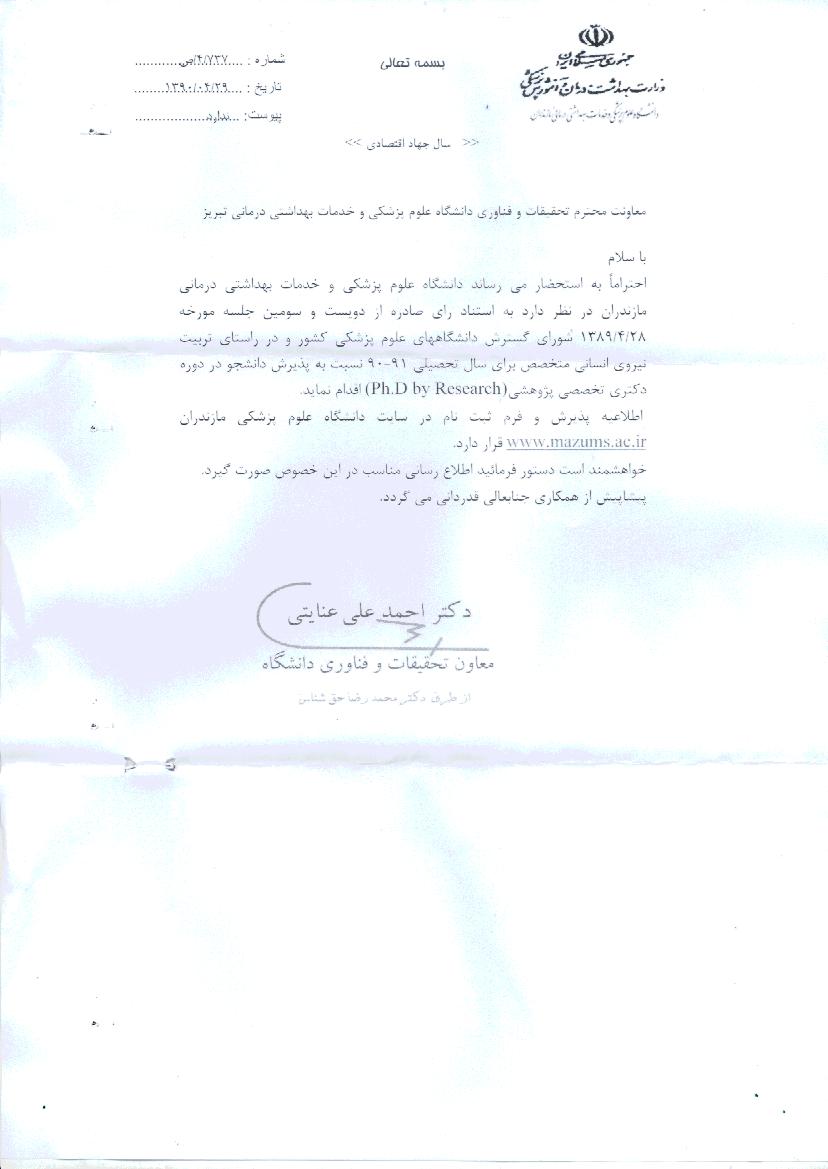 اطلاعیه پزیرش دانشجو دوره دکتری تخصصی پژوهشی دانشگاه علوم پزشکی مازندران