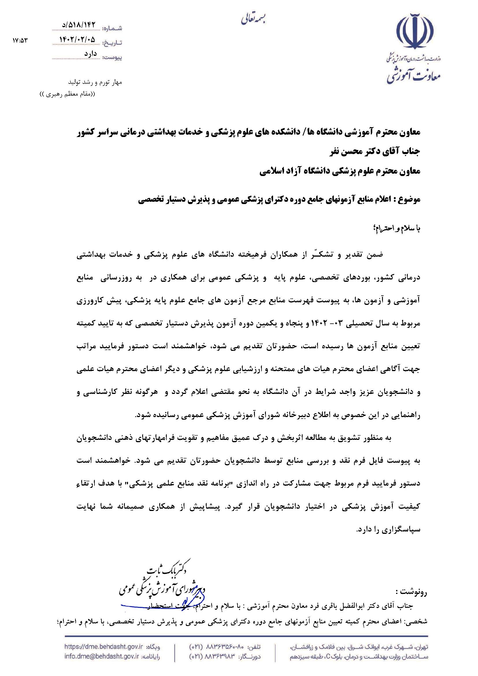 * منابع آزمون های پيش كارورزی از ابتدای اسفند 1۴۰2 تا پایان بهمن 1۴۰3 و پنجاه و یکمين دوره آزمون پذیرش دستيار تخصصی