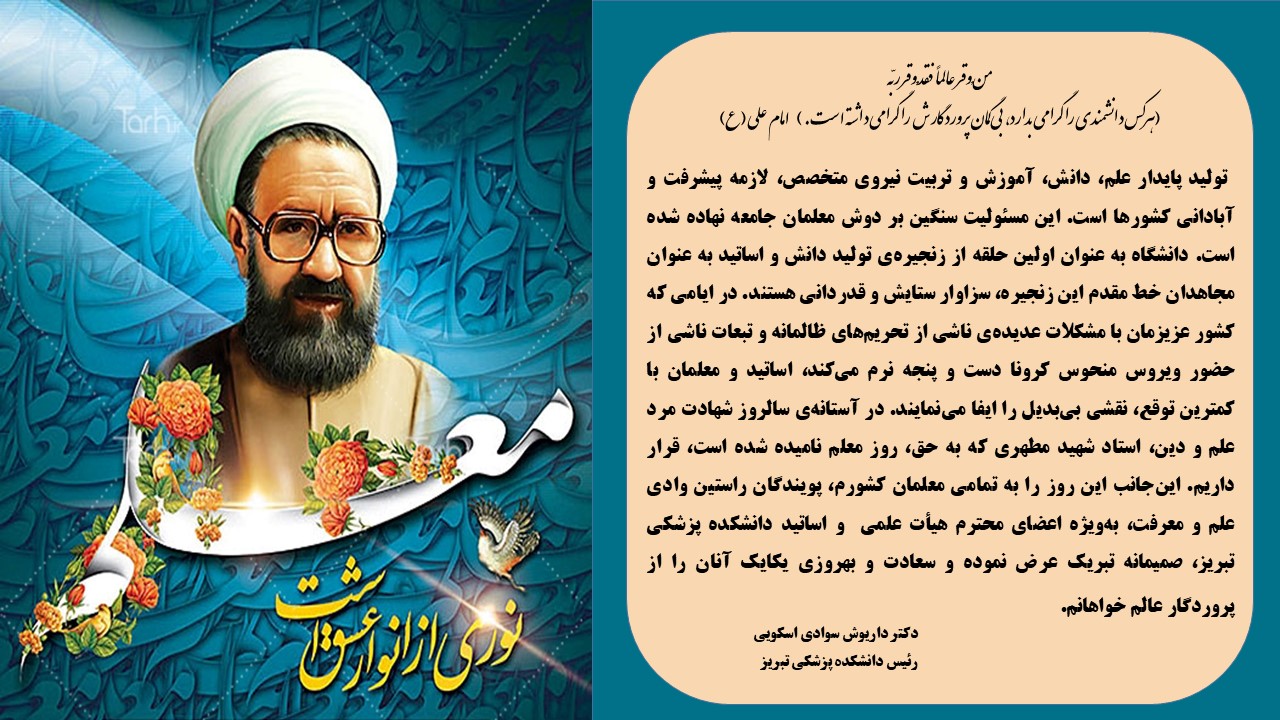 تولید پایدار علم ، دانش ، آموزش و تربیت نیروی متخصص، لازمه پیشرفت و آبادانی کشورها است. این مسئولیت سنگین بر دوش معلمان جامعه نهاده شده است. دانشگاه به عنوان اولین حلقه از زنجیرهی تولید دانش و اساتید به عنوان مجاهدان خط مقدم این زنجیره، سزاوار ستایش و قدردانی هستند. در ایامی که کشور عزیزمان با مشکلات عدیدهی ناشی از تحریمهای ظالمانه و تبعات ناشی از حضور ویروس منحوس کرونا دست و پنجه نرم میکند، اساتید و معلمان با کمترین توقع، نقشی بیبدیل را ایفا مینمایند. در آستانهی سالروز شهادت مرد علم و دین، استاد شهید مطهری که به حق، روز معلم نامیده شده است، قرار داریم. اینجانب این روز را به تمامی معلمان کشورم، پویندگان راستین وادی علم و معرفت، بهویژه اعضای محترم هیأت علمی و اساتید دانشکده پزشکی تبریز، صمیمانه تبریک عرض نموده و سعادت و بهروزی یکایک آنان را از پروردگار عالم خواهانم.