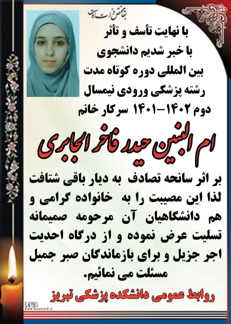 مرحومه «ام البنین حیدر فاخر الجابری»، دانشجوی بین الملل دوره کوتاه مدت رشته پزشکی ورودی نیمسال دوم ۱۴۰۲-۱۴۰۱ دانشکده پزشکی تبریز، بر اثر سانحه رانندگی دارفانی را وداع گفت.