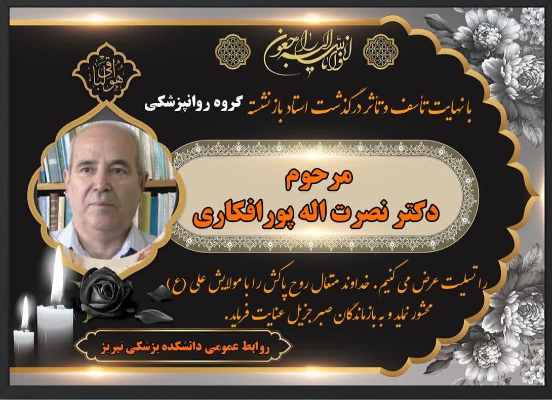 خبر تأسف بار درگذشت استاد فرهیخته گروه روانپزشکی دانشگاه علوم پزشکی تبریز زنده یاد مرحوم دکتر نصرت اله پورافکاری، موجب تألم و تأثر فراوان اینجانب و جامعه دانشگاهی گردید.دکتر نصرت اله پورافکاری، از اساتید برجسته دانشگاه علوم پزشکی تبریز، کتب و مقالات ارزشمندی از خود به یادگار گذاشتهاند. ایشان در کنار فعالیت گسترده علمی، به تمام معنا فردی دیندار، اخلاق مدار و متشخص بودند که همواره منش کریمانه و رفتار پدرانه ایشان در اذهان باقی خواهد بود.