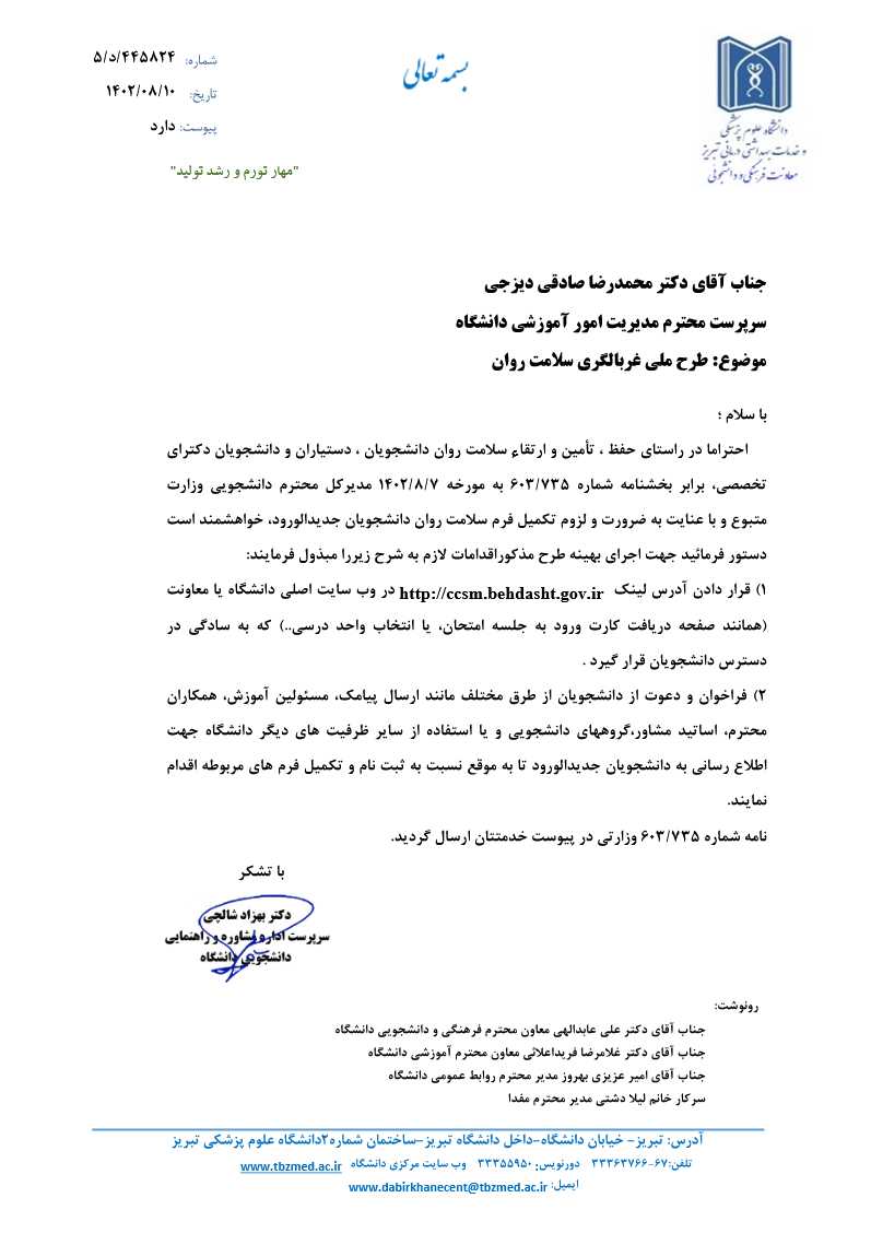 تاریخ انتشار : دوشنبه ۱۵ آبان ۱۴۰۲ تعداد بازدید کنندگان خبر : 26 زمان مطالعه : 1 دقیقه طرح ملی طرح ملی غربالگری سلامت روان کد خبر : 34281 کپی ارسال نظر ثبت