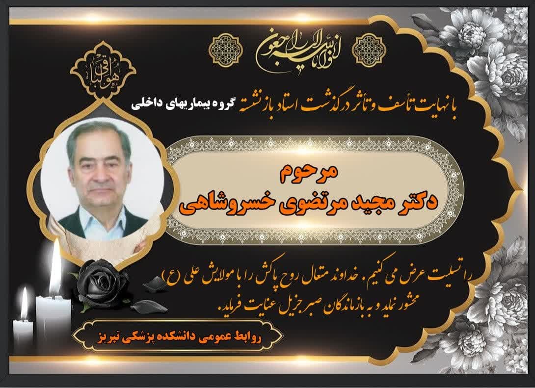 خبر تأسف بار درگذشت استاد فرهیخته گروه بیماریهای داخلی دانشگاه علوم پزشکی تبریز زنده یاد مرحوم دکتر مجید مرتضوی خسروشاهی، موجب تألم و تأثر فراوان اینجانب و جامعه دانشگاهی گردید.