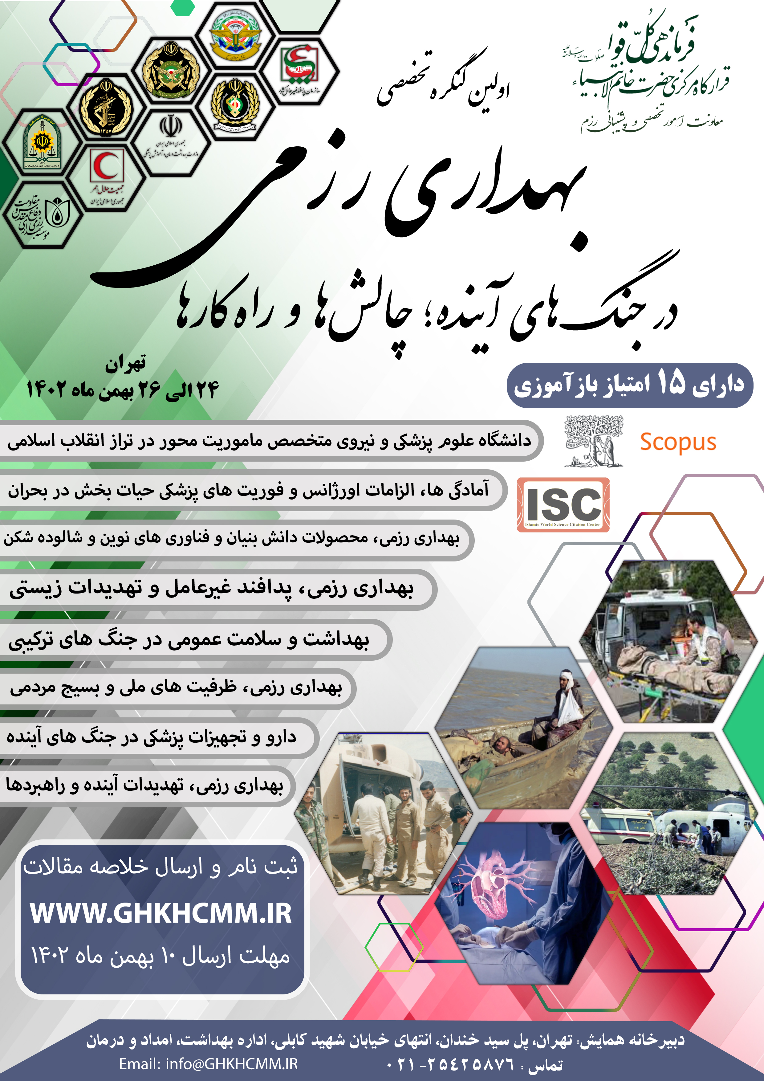 اولین کنگره تخصصی بهداری رزمی در جنگهای آینده،چالشها و راهکارها با امتیاز بازآموزی توسط معاونت امور تخصصی قرارگاه مرکزی حضرت خاتم الانبیاء(ص) فرماندهی کل قوا با همکاری و مشارکت معاونت تحقیقات و فن آوری وزارت بهداشت با هدف ارتقا سطح آمادگی مجموعه بهداشت و درمان کشور در پاسخ به بحران و تهدیدات در جنگهای آینده و بهره گیری از ظرفیتهای بالقوه و بالفعل بخش های مختلف کشوری و لشکری در این حوزه ، ایجاد وحدت رویه در اقدامات مشترک و هم افزایی.