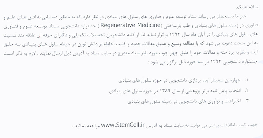 برگزاري جشنواره دانشجويي ستادتوسعه علوم و فناوري هاي سلولهاي بنيادي درآبانماه سال 93
