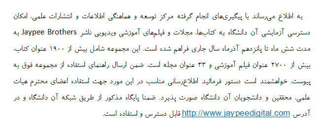 دسترسي آزمايشي دانشگاههاي علوم پزشكي كشور به پايگاه و منابع الكترونيكي ناشر Jaypee Brothers