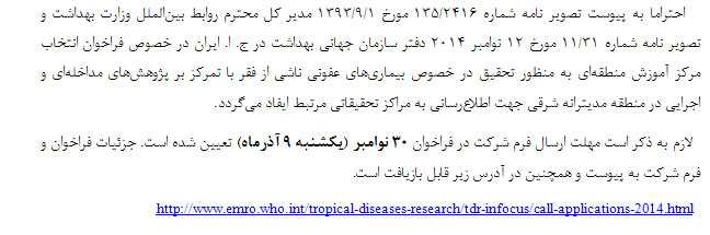 فراخوان انتخاب مركز آموزش منطقه اي براي تحقيق در خصوص بيماري هاي عفوني ناشي از فقر