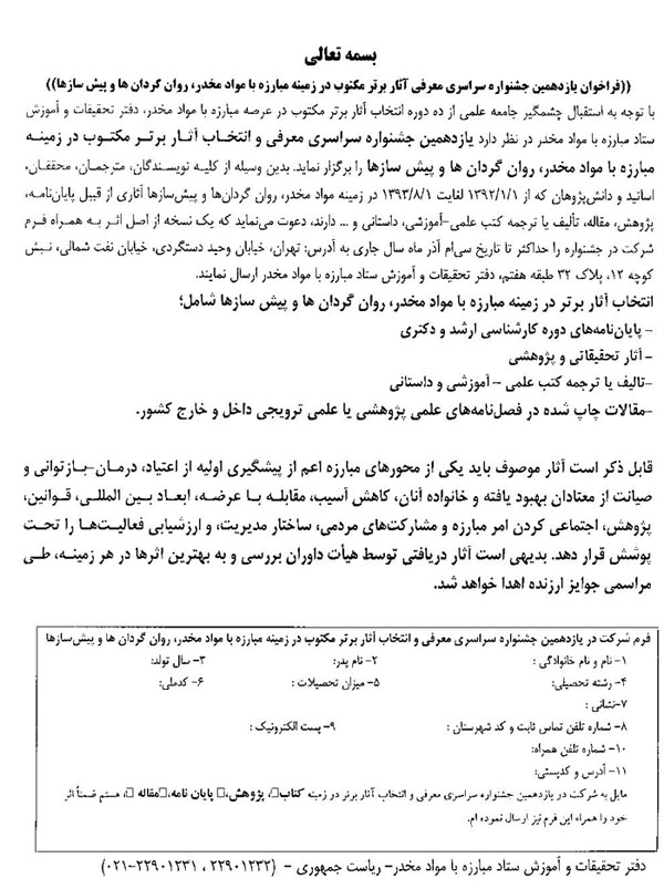 فراخوان يازدهمين جشنواره سراسري معرفي اثار برتر مكتوب در زمينه مبارزه با مواد مخدر روان گردانها و پي