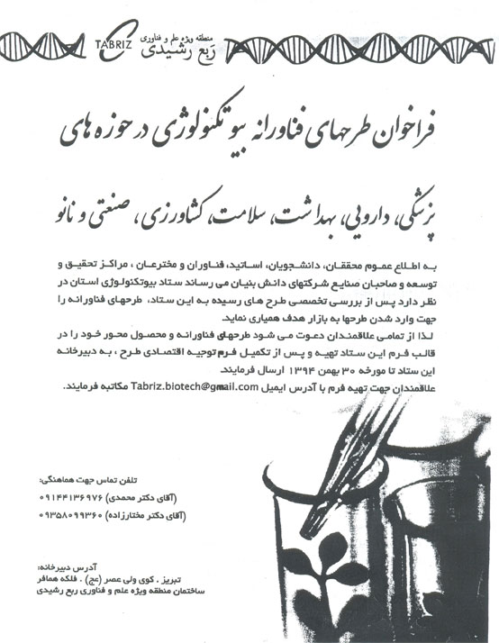 فراخوان طرحهای فناورانه بیوتکنولوژی در حوزه های پزشکی ، دارویی، بهداشت،سلامت،کشاورزی، صنعتی و نانو