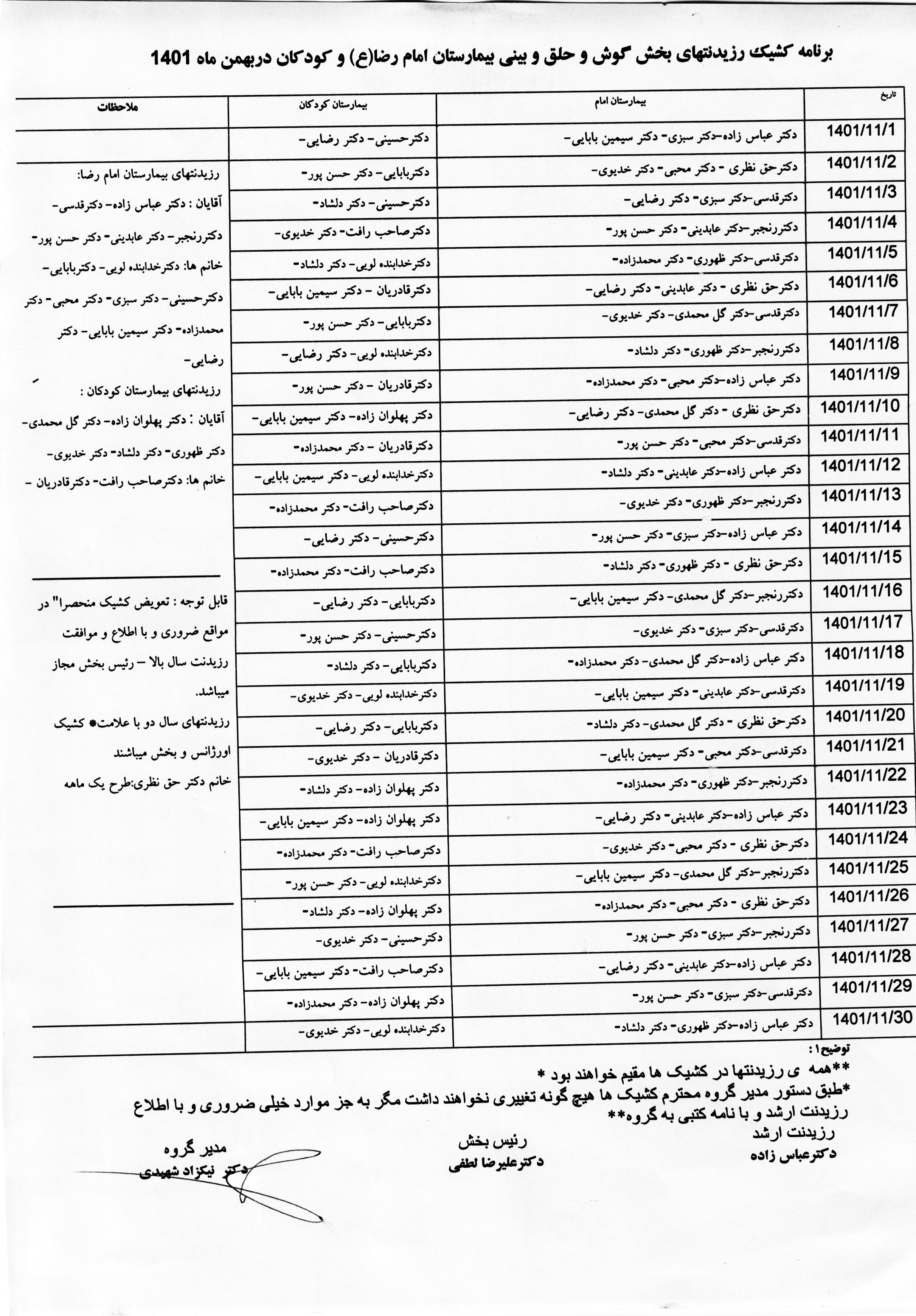 برنامه کشيک رزيدنتهای بخش گوش و حلق و بينی بيمارستان امام رضا(ع) و کودکان